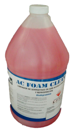 AC-FOAM es un enérgico limpiador de aluminio, serpentines de refrigeración y cajas de trailers. Sus ingredientes activos reaccionan químicamente con las incrustaciones de los serpentines de las unidades de refrigeración, generando una espuma limpiadora que extrae polvo, grasa, hollín, etc.